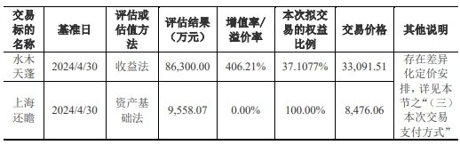 基于上述评估结果,经上市公司与交易对方协商,确定水木天蓬37.1077%股权的最终交易价格为33,091.51万元,上海还瞻100%出资份额的最终交易价格为8,476.06万元。