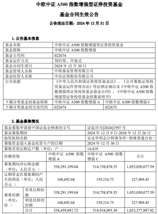 中国经济网北京12月31日讯 今日,中欧基金管理有限公司发布中欧中证A500指数增强型证券投资基金基金合同生效公告。