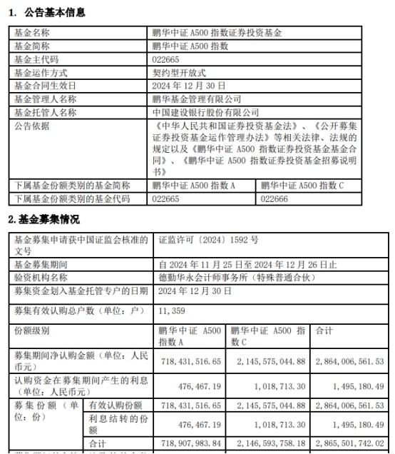 该基金募集期间净认购金额合计2,864,006,561.53元,认购资金在募集期间产生的利息合计1,495,180.49元,募集份额合计2,865,501,742.02份。