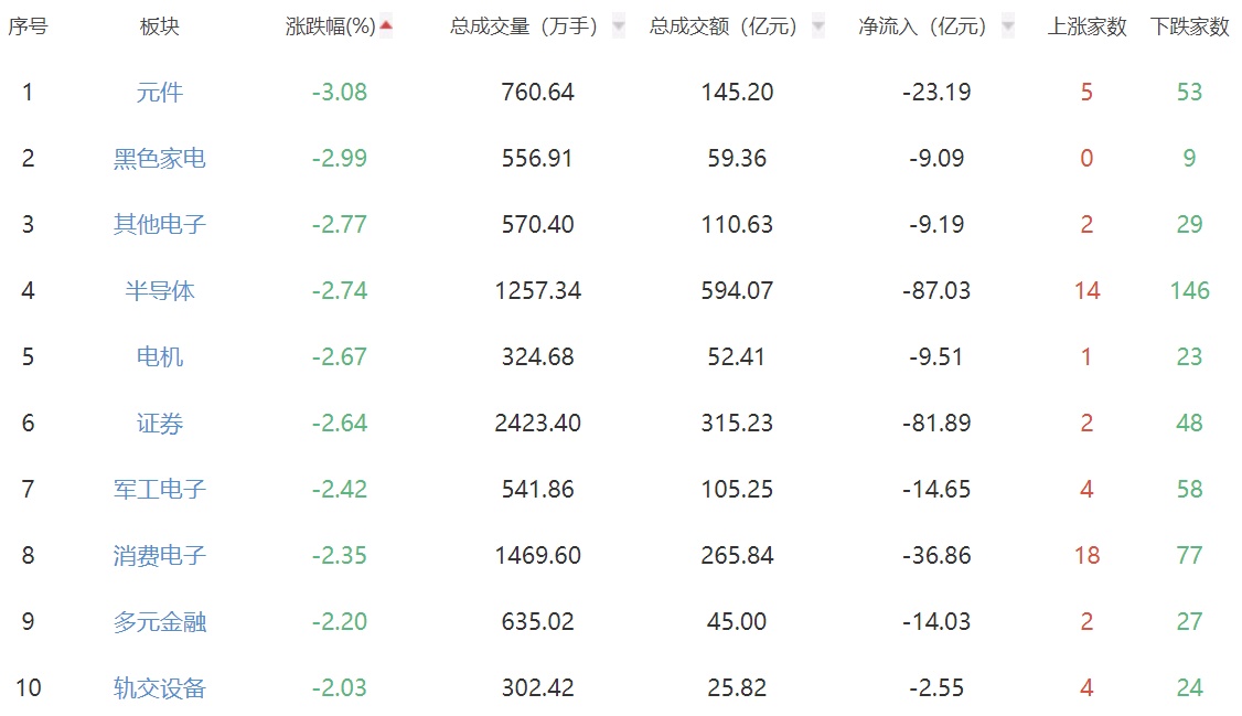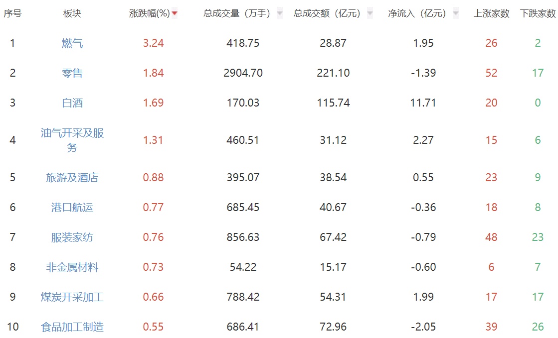 板块方面,燃气、零售、白酒板块涨幅居前,元件、黑色家电等板块跌幅居前。