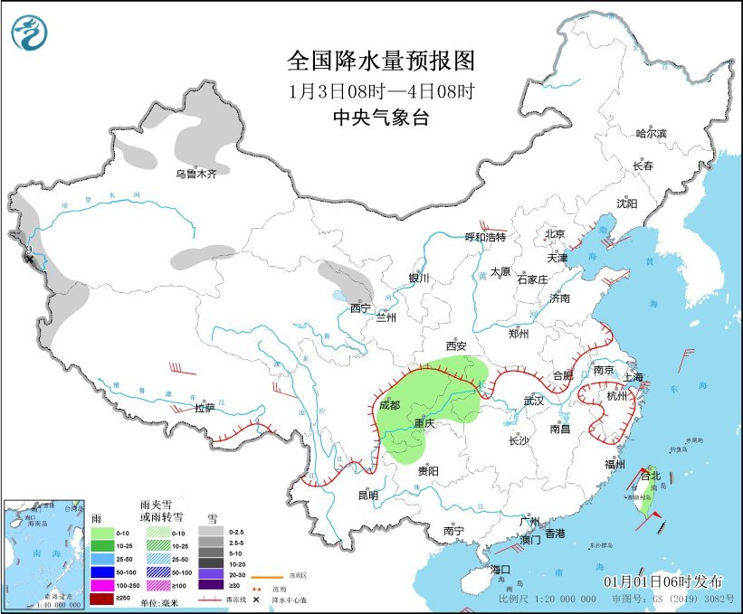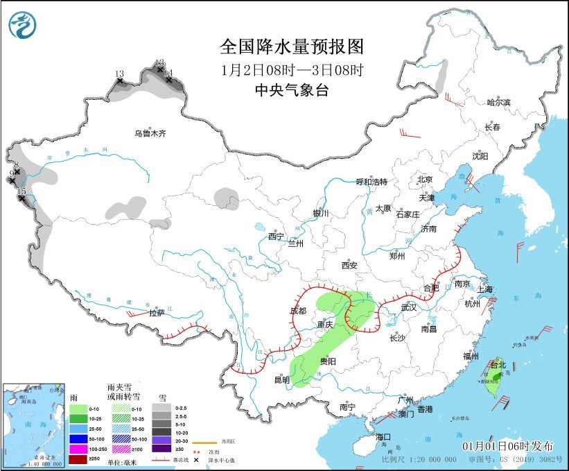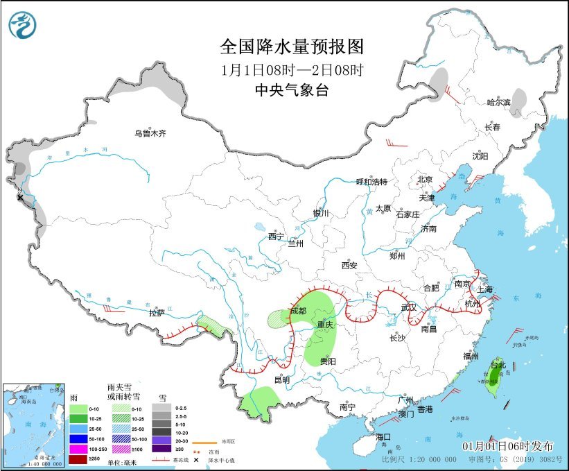 1月1日08时至2日08时,新疆北疆北部和南疆西部山区、西藏东南部、川西高原南部、内蒙古东北部、黑龙江东南部等地部分地区有小到中雪或雨夹雪,其中,新疆西南部山区局地有大雪(5~9毫米)。四川盆地中南部、贵州西部、云南南部、台湾岛等地部分地区有小到中雨。内蒙古中东部、辽东半岛、西藏南部、浙江东部沿海等地部分地区有4~6级风;台湾海峡、南海中北部和西南部海域、巴士海峡有6~7级、阵风8级的东北风或偏北风。