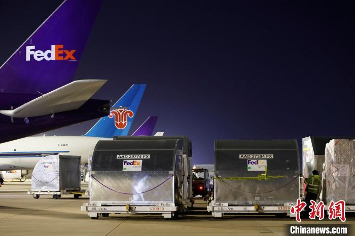 浦东国际机场货运停机坪上,工作人员在清点即将装运的货物。中新网记者 殷立勤 摄