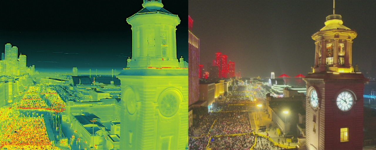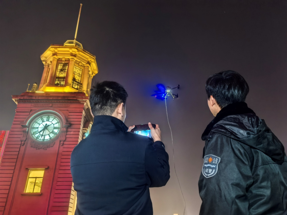 “10,9,8……3,2,1” 当江汉关跨年钟声敲响,现场十余万市民一起倒数庆祝2025新年快乐时,视侦支队无人机大队副大队长刘宇飞和辅警张玉泉使用“空中鹰眼”警用无人机开展空中巡逻,利用搭载红外热成像和变焦双光镜头守护市民平安。值得一提的是,本次使用的系留无人机可实现长航时悬停,解决了传统无人机需要更换电池的痛点。