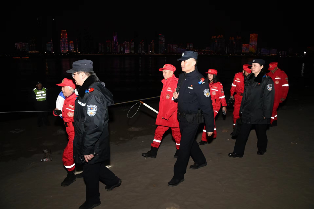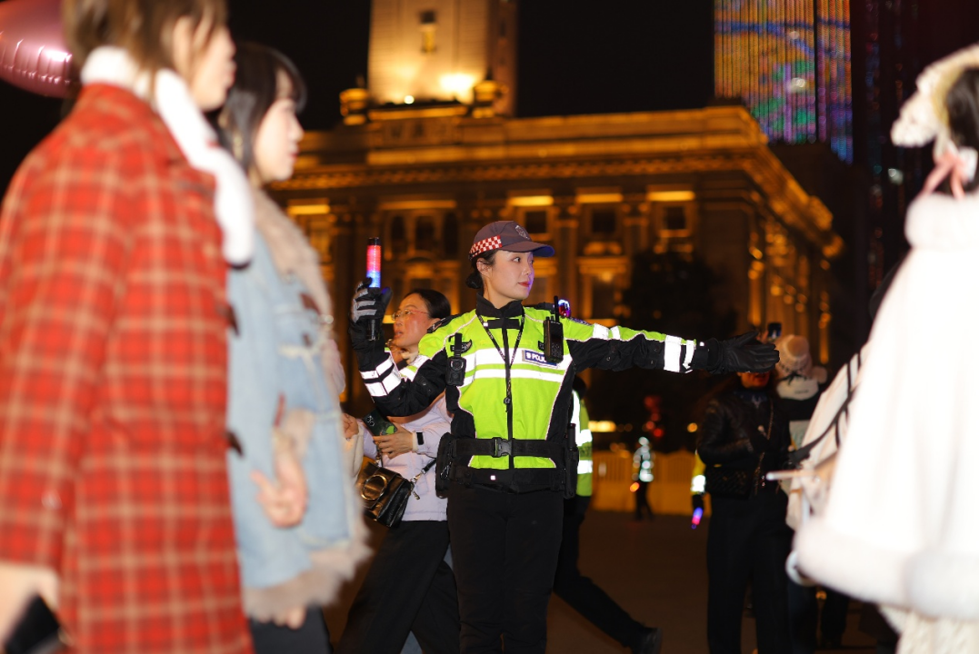 除了江汉关以外,夜幕下的两岸灯光秀正在精彩上演,吸引了无数市民游客驻足观看。长江大桥下,户部巷、斗级营等网红打卡处也是人流如梭,市民群众在此聚集,等待新年的钟声敲响。“请问中华路码头怎么走?”正在户部巷执勤的中华路所副所长全抱龙耐心为游客介绍,当晚已经为数十位游客充当“警色导游”解疑答惑,指引方向。