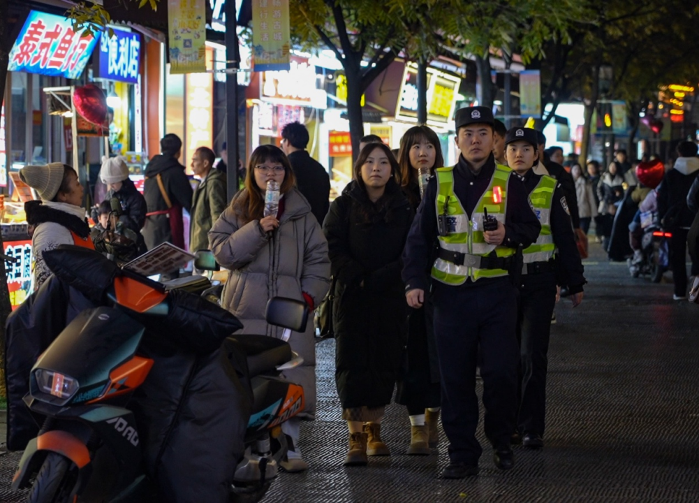 跨年夜的光谷步行街,人潮涌动,灯火辉煌,每一处都洋溢着节日的喜庆与热闹。光谷广场周边及路口上,民警巡逻执勤、站岗守卡、路面保畅的身影随处可见。东湖高新公安分局将警力摆在人民群众随时看得见、用得着的地方,通过“智慧安防+巡逻防控”,实现全方位、无死角安保防控,为市民欢度佳节保驾护航。