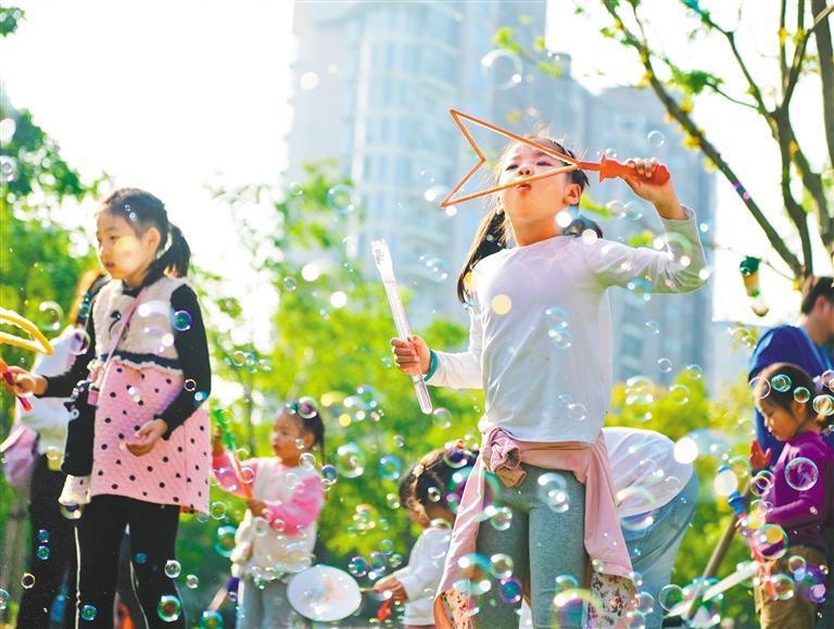 2024年10月14日,孩子们在杨浦228街坊大草坪上欢快玩耍。曾经的“两万户”工人新村,如今蝶变为“人民城市样板间”。 张 励摄(中经视觉)