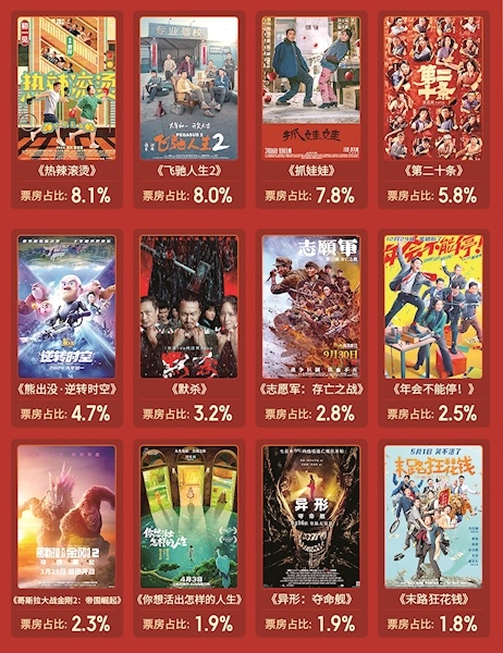 2024年“年度票房TOP10”榜单中,国产片的表现同样强势,共占据8席,另外两个名额被好莱坞怪兽片和日本动画电影拿下。猫眼专业版统计数据显示,这10部2024年中国电影市场的“优等生”分别是:《热辣滚烫》《飞驰人生2》《抓娃娃》《第二十条》《熊出没·逆转时空》《默杀》《志愿军:存亡之战》《年会不能停!》《哥斯拉大战金刚2:帝国崛起》《你想活出怎样的人生》。值得一提的是,《热辣滚烫》还成功跻身全球年度票房榜前十。