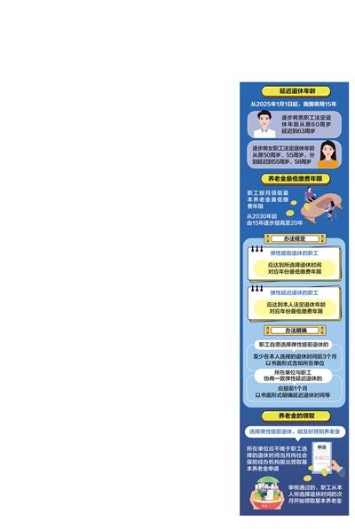 除延迟法定退休年龄外,决定将职工按月领取基本养老金最低缴费年限,从2030年起由15年逐步提高至20年。办法规定,弹性提前退休的职工,应达到所选择退休时间对应年份最低缴费年限;弹性延迟退休的职工,应达到本人法定退休年龄对应年份最低缴费年限。