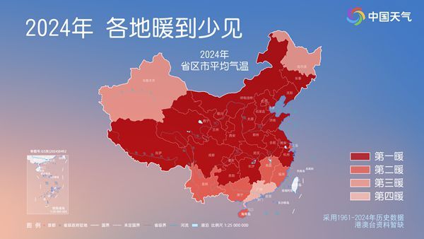 从各省市区(不含港澳台)2024年的平均气温来看,均进入观测史前四,其中22个省区市为1961年以来最暖,6个省区市为第二暖,2个第三暖,1个第四暖。