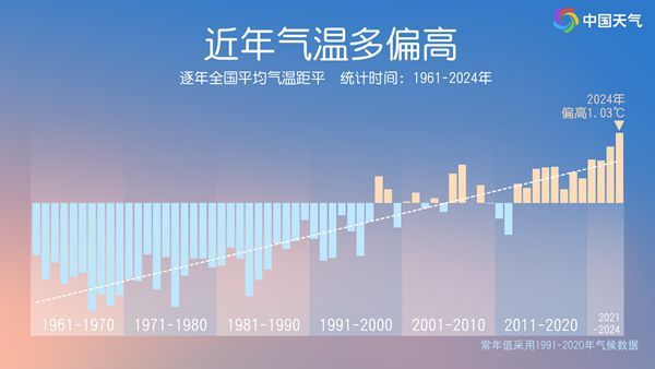 这是2025年的第一篇推送,新年第一天,我们又又又又见证历史了。刚刚过去的2024年,全国平均气温10.92℃,较常年同期偏高1.03℃,是1961年有完整观测记录以来最暖的一年。