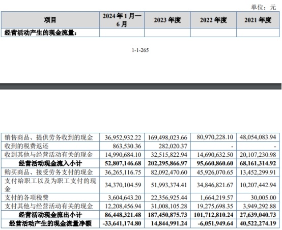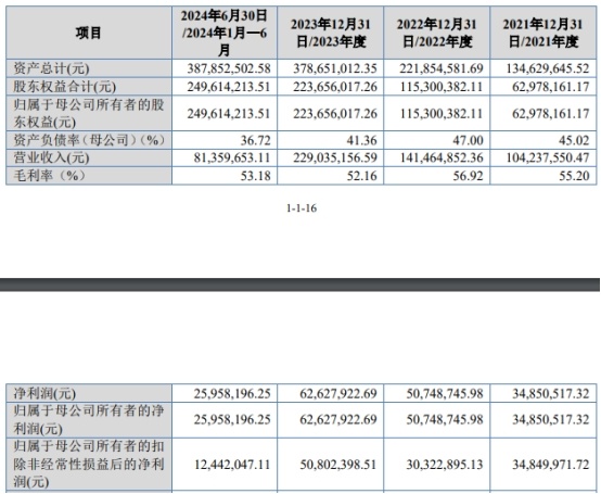 2021年至2023年,公司营业收入分别为1.04亿元、1.41亿元、2.29亿元,净利润/归属于母公司所有者的净利润分别为0.35亿元、0.51亿元、0.63亿元,归属于母公司所有者的扣除非经常性损益后的净利润分别为0.35亿元、0.30亿元、0.51亿元,经营活动产生的现金流量净额分别为0.41亿元、-0.06亿元、0.15亿元。各期公司销售商品、提供劳务收到的现金分别为0.48亿元、0.81亿元、1.69亿元。
