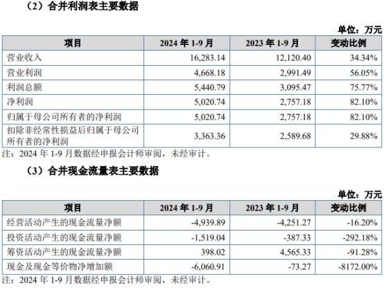 2024年1-9月,公司营业收入为1.62亿元,同比增长34.34%;净利润/归属于母公司股东的净利润为0.50亿元,同比增长82.10%;经营活动产生的现金流量净额为-0.49亿元,上年同期为-0.43亿元。
