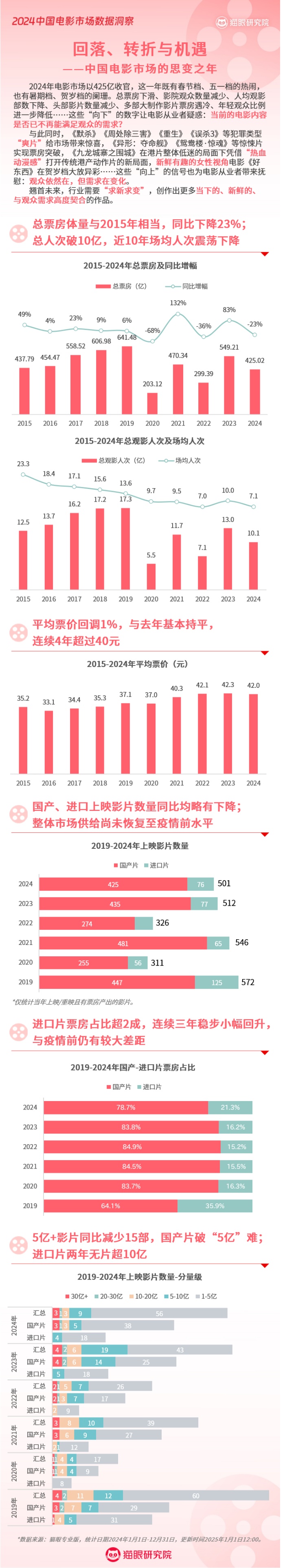 数据显示,2024年中国电影总票房425.02亿,总观影人次突破10亿,其中票房超10亿新片共7部,数量相比往年有所减少,市场缺乏头部电影拉动票房。综合来看,去年电影市场表现喜忧参半,一方面面临优质内容供给不足的挑战,另一方面多元题材尝试满足观众多元化观影需求,市场成长空间仍然巨大。面对这一形势,电影从业者需积极应对,携手努力,共同推动电影市场的繁荣发展。