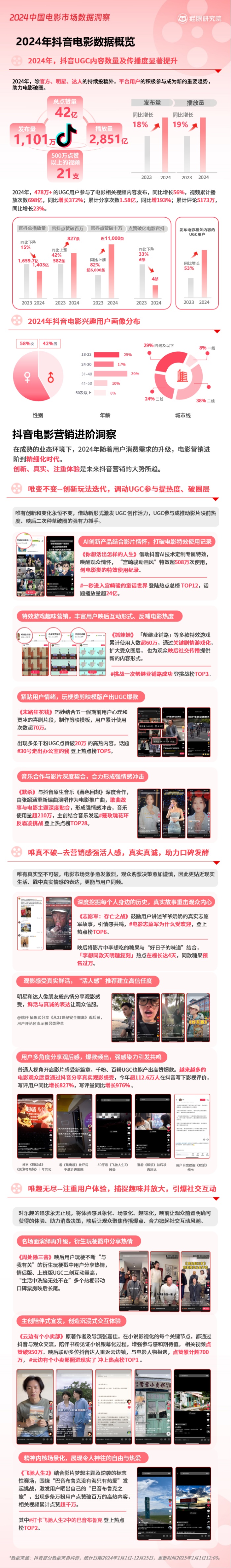 虽然电影票房成绩回落,但硬币的另一面,公众对电影营销的参与度有所提升。数据显示,2024年抖音平台上的电影内容互动显著增强,全年超478万UGC用户发布了电影相关视频,较2023年增长了56%;视频累计播放次数超698亿次,同比增长高达372%;分享次数超1.58亿次,同比增长193%。