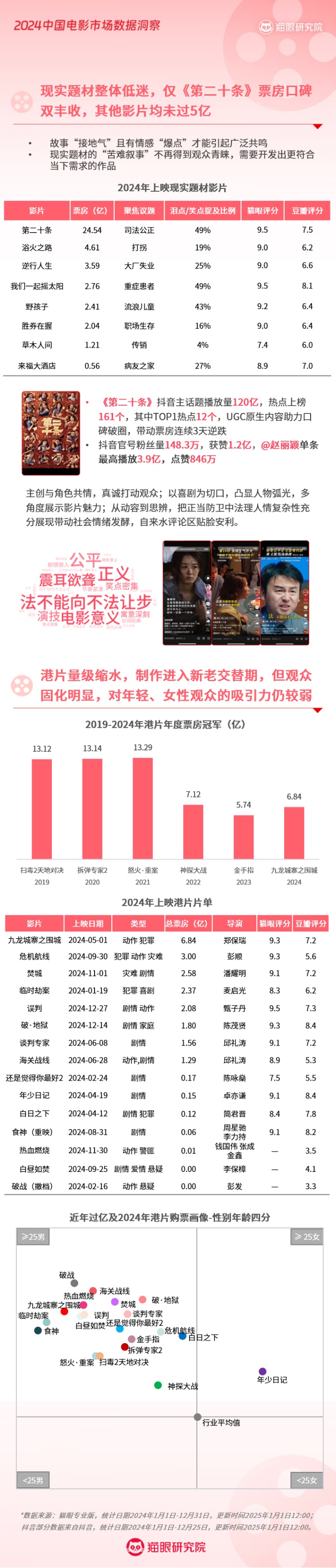 今年现实题材影片中,仅《第二十条》实现了票房与口碑的双丰收,说明故事“接地气”且有情感“爆点”才能引起广泛共鸣。香港电影也呈现出观众固化的问题,对年轻、低频观影群体的吸引力稍显不足。显然,电影需打破传统叙事框架,才能吸引年轻观众走进影院。