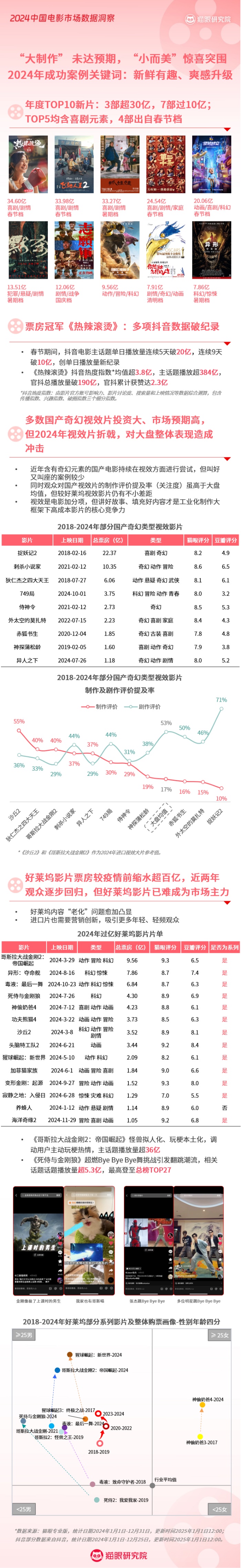 总体来看,2024年是中国电影市场的思变之年。这一年,票房震荡回落、观众群体结构固化等现象引发了行业内外的关注和思考;同时,一些创作者对故事形态的独特创新和不懈探索,也受到了市场的认可与赞誉。此外,在创新营销潮流的引领下,广大观众所给予的积极反馈,也充分彰显了中国电影市场所蕴含的潜能与韧性。银幕外的故事仍未结束,中国电影的未来,有待我们大家去书写。