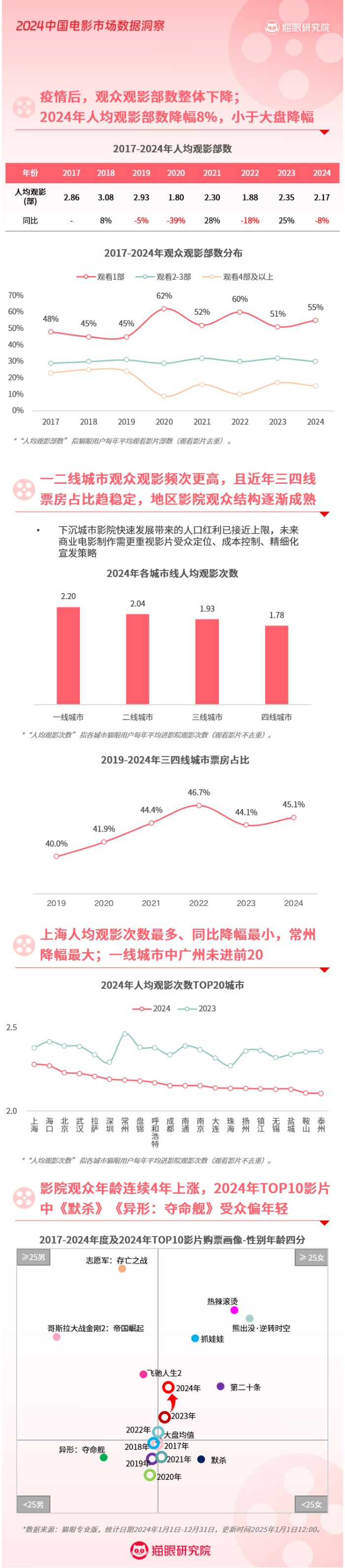 中国电影市场的潜力票仓,在于年轻及观影频次较低的观众群体。档期票房显示,2024年部分重点档期的头部影片影响力减弱,导致轻频观众的观影意愿不高。同时影院观众年龄已连续4年上涨,TOP10影片中仅《默杀》《异形:夺命舰》观众相对年轻。随着下沉市场的日益成熟及影城经营的平稳发展,明确影片受众定位、匹配精细化宣发变得愈加重要。未来电影创作需要朝着吸引并激活年轻、轻频观众的方向发展,促进大盘票房提升。