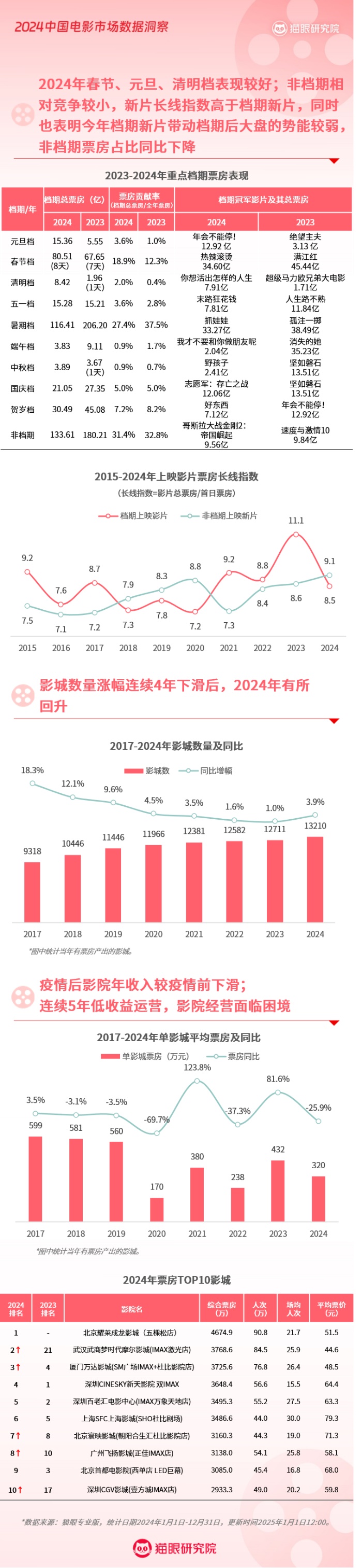中国电影市场经历了跌宕起伏的一年。2025年1月1日,猫眼研究院发布《2024中国电影市场数据洞察》(简称《洞察》),从票房表现、观影群体特征、影片类型题材以及市场营销趋势等多个维度,展现电影市场变化与发展趋势,为行业内外提供数据参考。