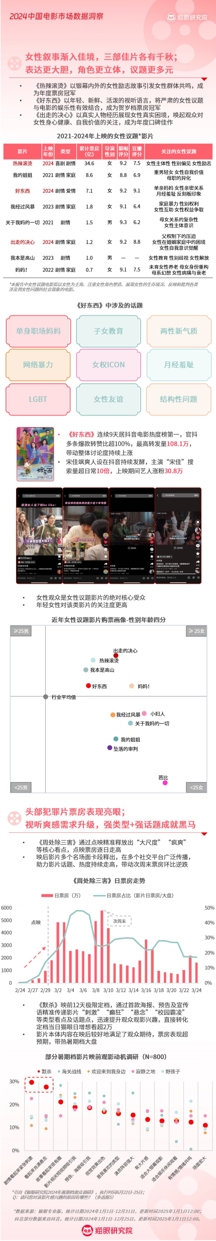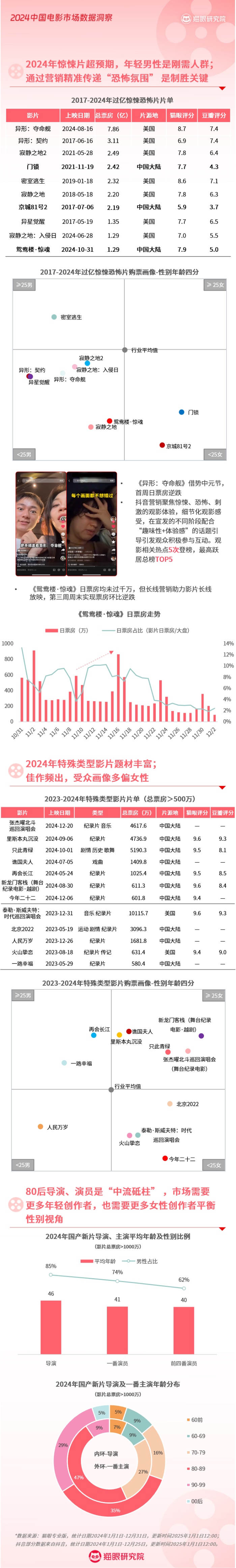 传统叙事呈现颓势的同时,电影市场也涌现出不少亮点。2024年,女性议题备受瞩目,《热辣滚烫》《好东西》《出走的决心》等影片口碑票房双收,女性叙事渐入佳境。同时,极具视听爽感的犯罪片票房亮眼,如《默杀》凭借强类型与强话题属性,成为暑期档“黑马”。另外,2024年惊悚片表现超预期,年轻男性是刚需受众。国产惊悚片《鸳鸯楼·惊魂》凭借“恐怖氛围”的长线营销,带动影片上映三周后周末票房逆势走高。而纪录片与音乐题材等特殊类型影片也百花齐放,佳作频出,吸引更多女性观众走进影院。