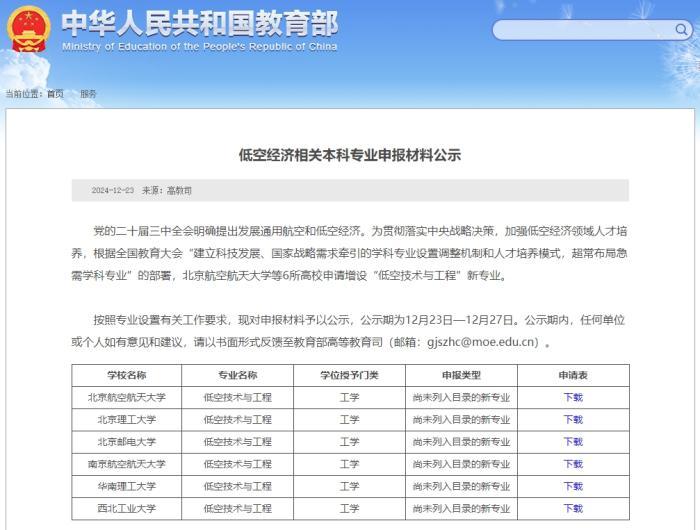 12月23日,教育部网站公示了低空经济相关本科专业申报材料,北京航空航天大学、北京理工大学、北京邮电大学、南京航空航天大学、华南理工大学、西北工业大学6所高校申请增设“低空技术与工程”新专业。