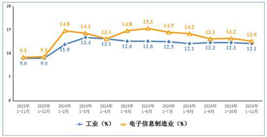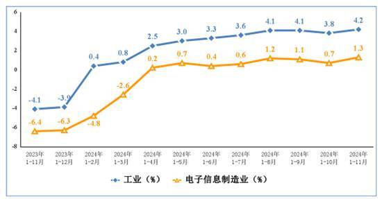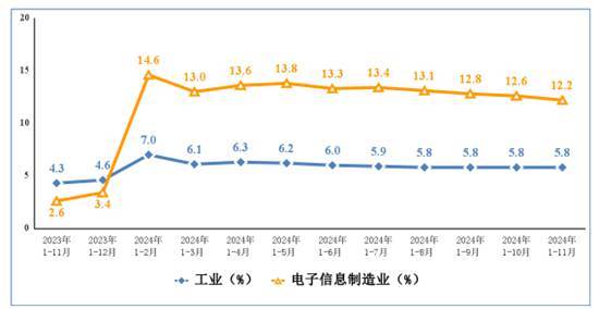 中国经济网北京1月3日讯(记者 殷俊红)记者从工业和信息化部获悉, 2024年1-11月我国电子信息制造业生产增长较快,规模以上电子信息制造业增加值同比增长12.2%,增速分别比同期工业、高技术制造业高6.4个和3.2个百分点。11月同比增长9.3%。