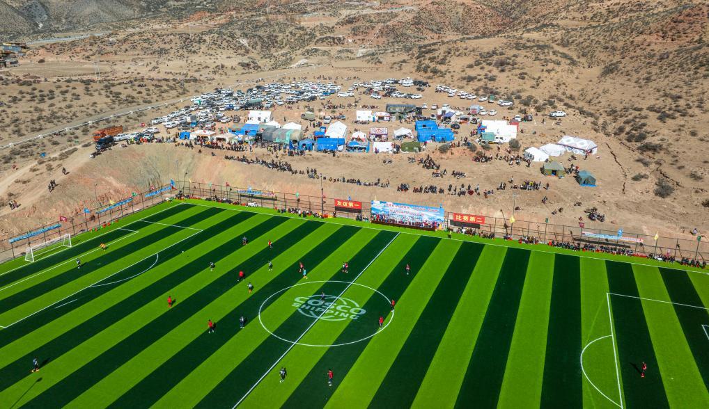 在马利镇“云中球场”,球员们正在比赛中(1月2日摄,无人机照片)。新华社记者 丁增尼达 摄