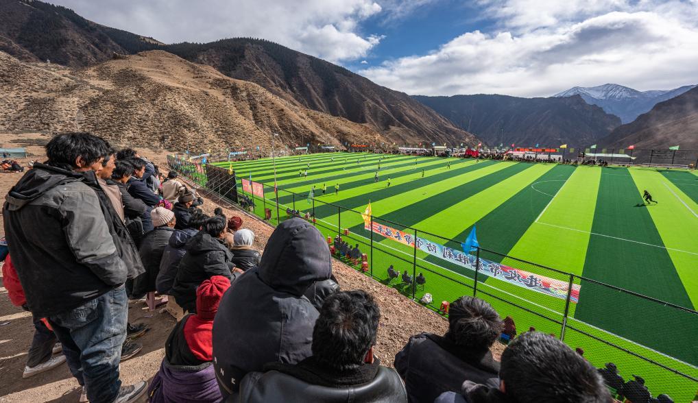 在马利镇“云中球场”,球迷们席地而坐观看比赛(1月2日摄)。新华社记者 丁增尼达 摄