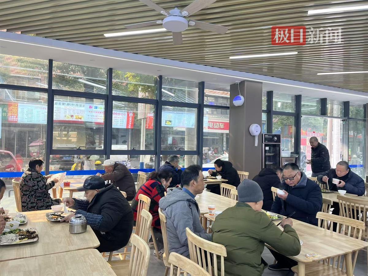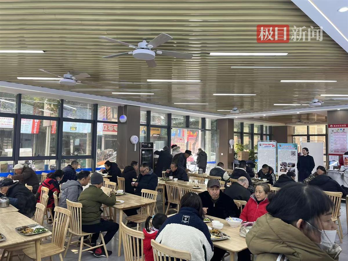 在幸福食堂内,老街坊们围坐起来吃饭聊天,这一群银发族当中,极目新闻记者发现有不少年轻人也来“蹭饭”,基本呈现“五五开”的场面。