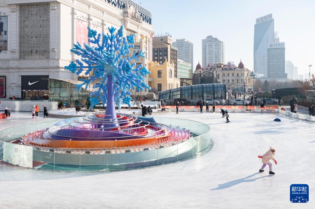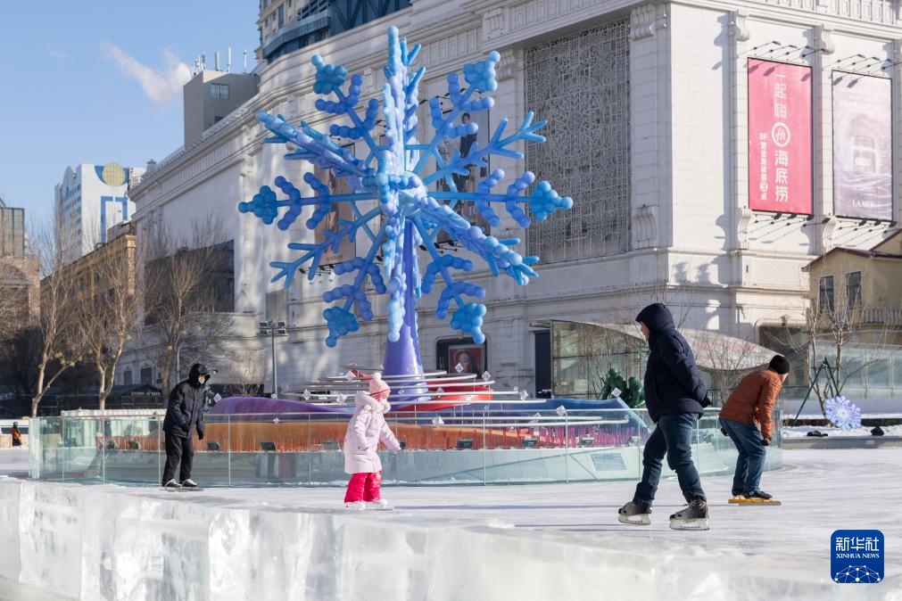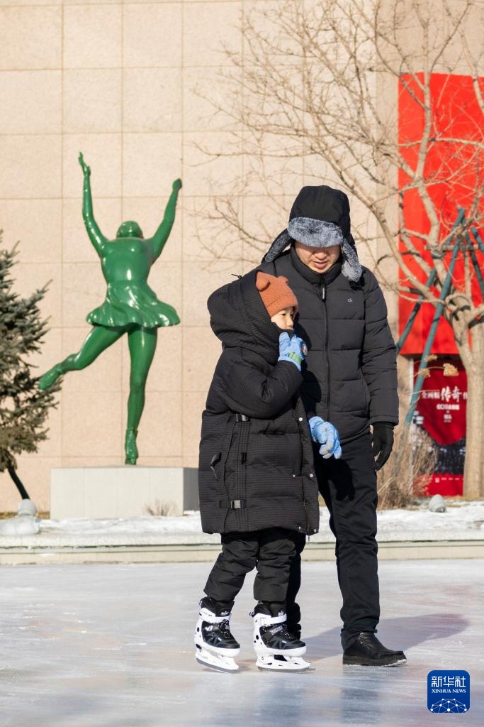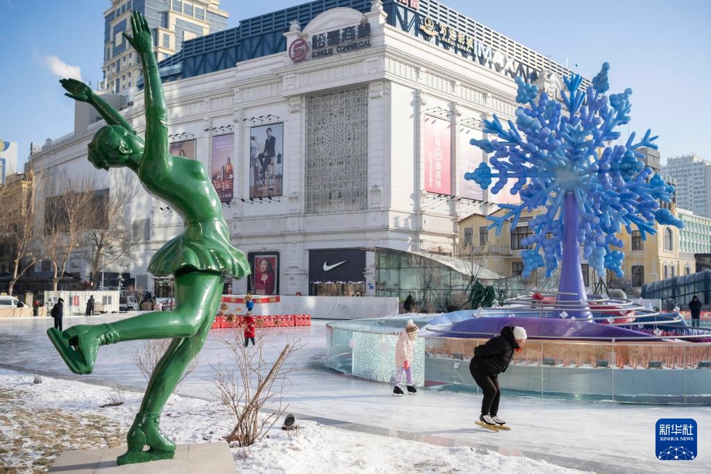 1月4日,在哈尔滨市南岗区一处公益冰场,人们在“冰雪之冠”雕塑旁滑冰。
