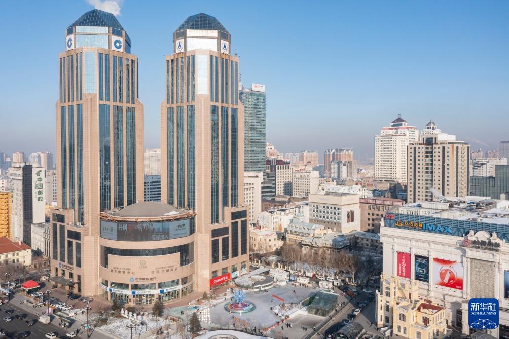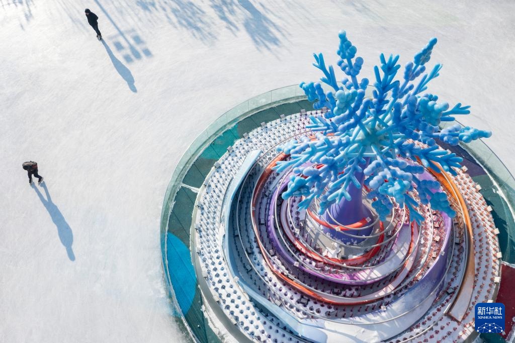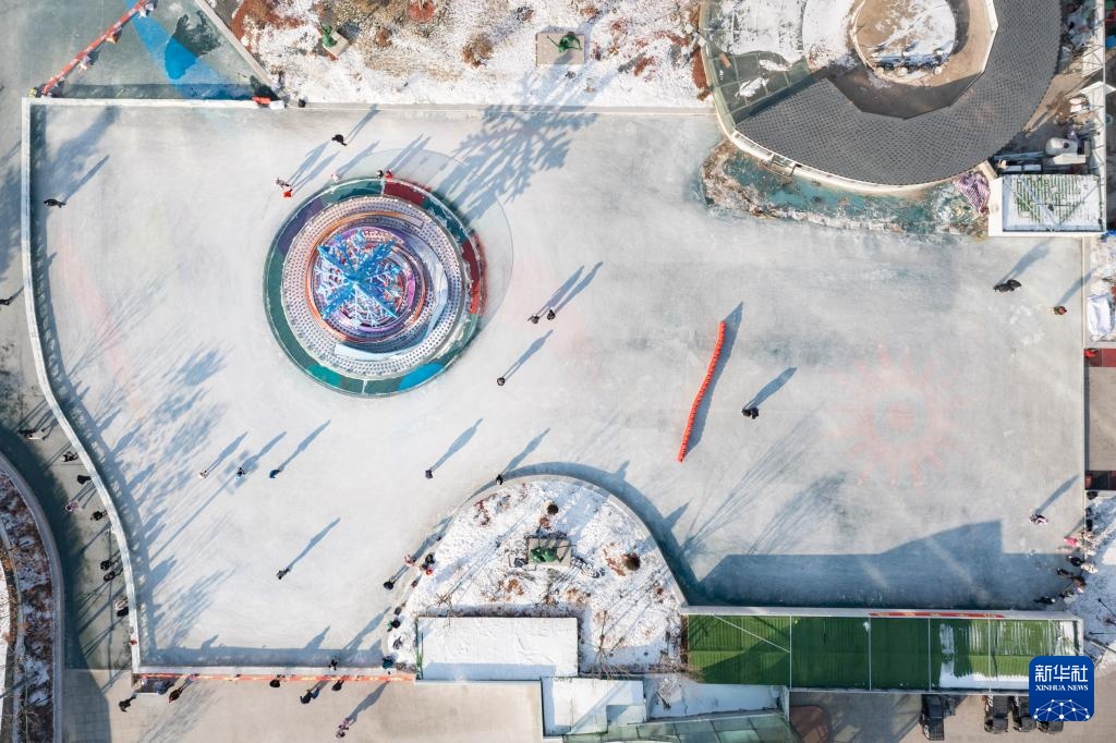 1月4日,在哈尔滨市南岗区一处公益冰场,人们在“冰雪之冠”雕塑旁滑冰(无人机照片)。