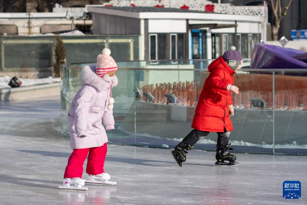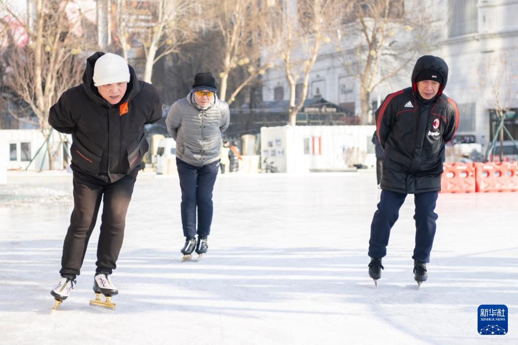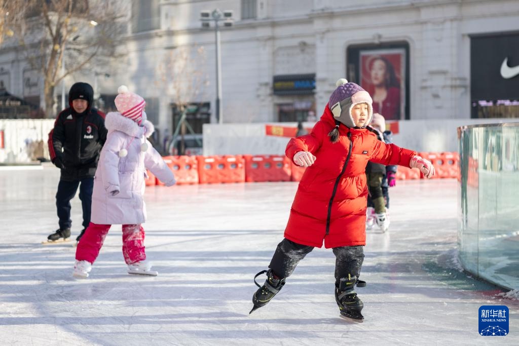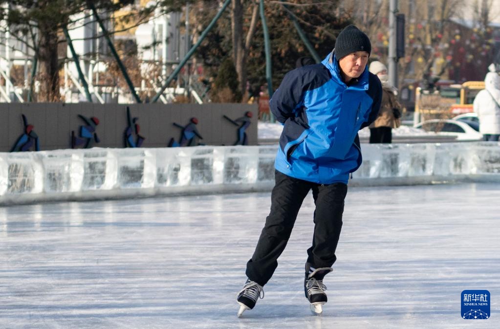 1月4日,人们在哈尔滨市南岗区一处公益冰场滑冰。