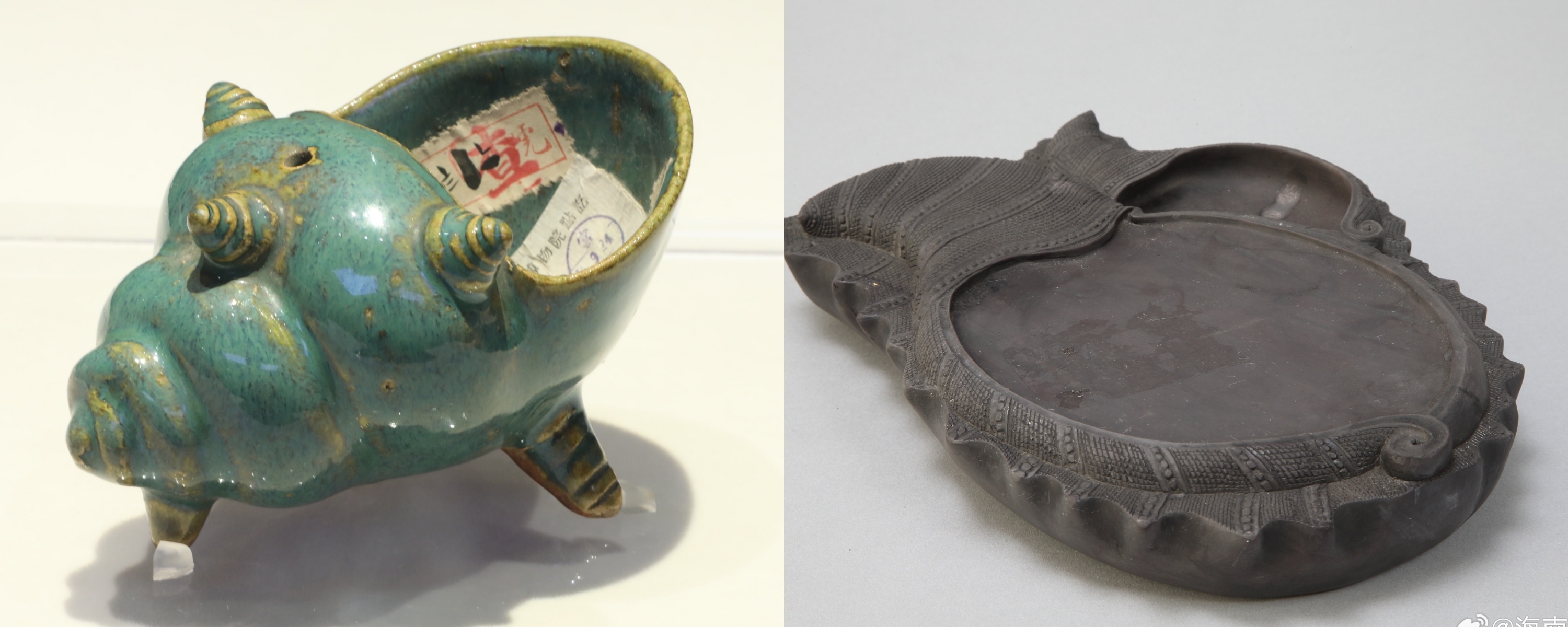 △其他造型的文房用具。左为广窑绿釉海螺式水丞(故宫博物院藏),仿天然海螺造型。右为端石海螺式砚(故宫博物院藏),形如海螺。