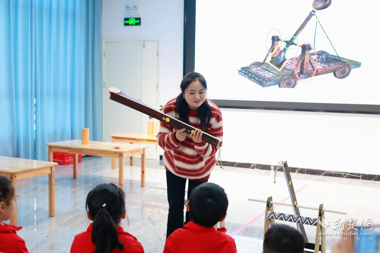 荆楚网(湖北日报网)讯(通讯员 纪幼)近日,荆州市机关幼儿园赴江陵县送教——大班科学活动《小杠杆大智慧》。活动以“三国投石器”为引,紧扣幼儿科学学习与发展核心经验,提供不同层次材料支持,在幼儿与材料的不断“对话”中获得新的知识经验,从而实现深度学习,让幼儿充分体验科学探究的乐趣。