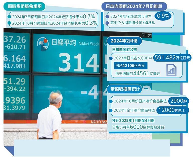 高物价侵袭日本社会。2024年年初,日本总务省公布的数据显示,过去一年间,包括食品、能源等在内的生活必需品价格同比上涨6.2%,创下了有可比数据以来的最大涨幅。而2024年,日本物价上涨的趋势依然没有改变。日本总务省公布的数据显示,截至2024年11月份,日本除生鲜食品以外的核心消费者价格指数同比上涨2.7%,为连续39个月同比上升。大米类价格高企成为最主要推动因素之一。据日本媒体统计,2024年10月份日本大米类价格同比上涨58.9%,创下40多年来最高涨幅纪录,该数据在9月份已经高达44.7%。事实上,日本大米类价格暴涨早已在预料之中。2024年7月份以来,日本出现“大米骚动”,在地震预警的刺激下,民众纷纷到超市抢购大米,导致货架被“洗劫一空”。陈米因2023年酷暑供应量不足,而新米尚未上市,大米供应“青黄不接”,进一步加剧了短缺状况。在此过程中,日本农林水产省担忧米价下降,拒绝地方政府要求,不肯开仓放粮,此消彼长之中,新上市的大米成为稀缺资源,价格水涨船高。日本调查公司帝国数据库统计结果显示,2024年10月份日本涨价食品数高达2900种,2024年全年涨价商品将达到1.2万种以上。预计2025年1月份至4月份,日本仍将有6000余种食品涨价。对于恩格尔系数接近30%的日本社会而言,食品价格飙升将给民众生活带来明显压力。