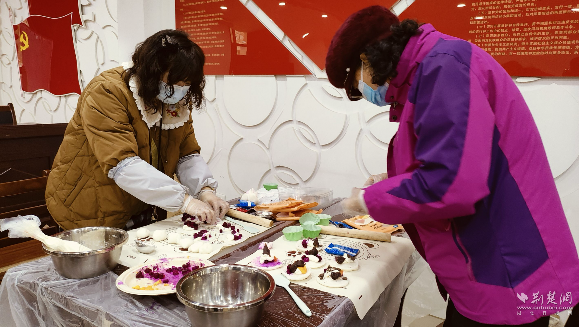 活动最后是雪媚娘制作环节。工作人员在桌上摆放了预拌粉、奶油、各种口味的馅料以及制作工具,并在一旁进行耐心指导。尽管大部分参与者都是初次尝试糕点制作,但他们全身心投入到每一个环节,从揉面、擀皮、挤奶油、包馅再到包装,尽情享受手工制作带来的乐趣。