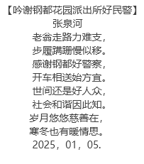 本以为事情已经告一段落,没想到张爹爹当晚就即兴创作了一首诗并转交给民警,为钢都花园派出所民警辅警的暖心帮助点赞。