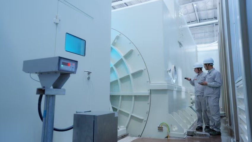 工作人员检查300兆瓦压气储能示范工程发电机。受访者供图