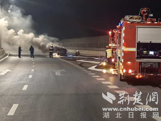 当天23:50分,两人从掇刀驱车回家,路过荆山大道高架桥时,看到前方一辆轿车冒烟起火,赶紧停车查看。驾驶员已惊慌失措离开车辆,在路边焦急无助。他们夫妻二人赶紧上前询问,得知驾驶员除了头发烧焦了一些,其他地方并未受伤,紧接着拨打了119和110寻求支援。