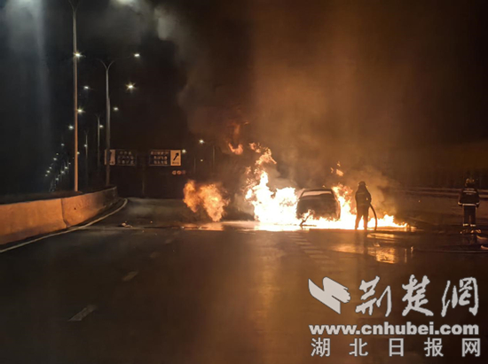 随着火势的增大,这辆着火的车还停在路中间无法移动,考虑到火势还可能引发其他上桥的车有燃烧的危险,杨海、张雨婷在安抚了驾驶员后,又将自己的车横在上桥的位置,并挥手让前来的车辆停车,劝阻车辆和行人掉头,并疏散围观人群,消除安全隐患。一直到消防人员赶来将车上的火扑灭,确定现场不需要帮忙后,夫妻俩才驱车往家赶,此时,已是第二天凌晨1时许。目前,车辆起火原因经初步排查疑似充电宝起火引发。