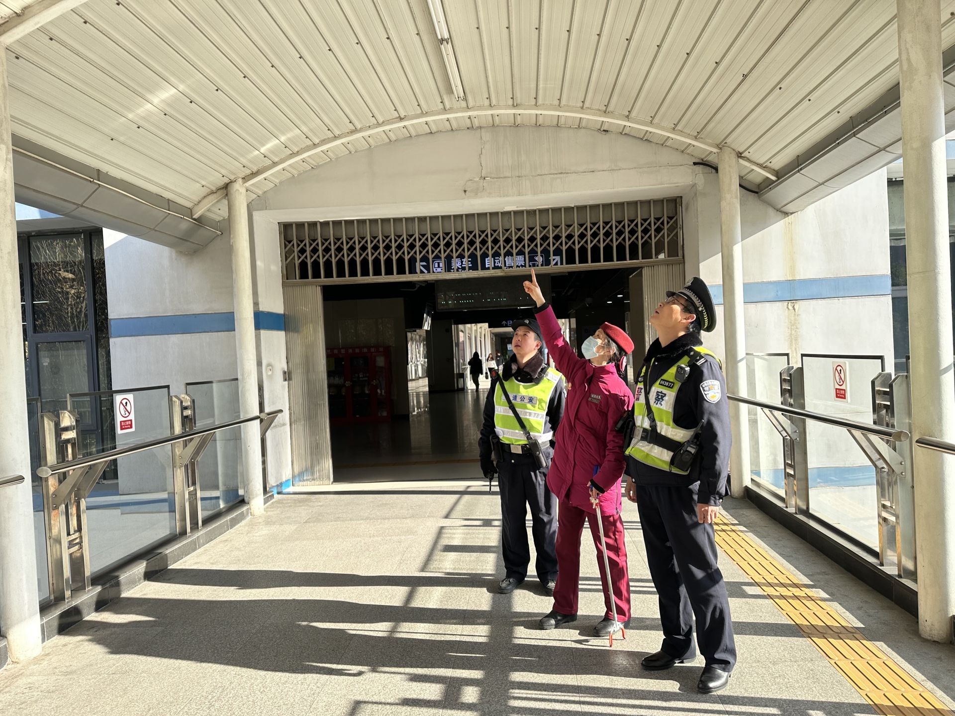 9时许,暖阳初升,身处轻轨1号线古田四路站站台,一丝丝凛冽的寒风扑面而来,依旧让人打起了寒颤。来到地铁站出入口通道,民警胡杰正带领辅警董新枫进行安全检查。一路上,他们重点检查了地铁站外墙顶棚、天桥顶棚等,确保各类设施设备完好,最大限度保障乘客出行安全。