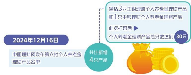 随着个人养老金制度在全国实施,个人养老金理财产品再度扩容。2024年12月16日,中国理财网发布第六批个人养老金理财产品名单,共计新增4只产品,包括3只工银理财个人养老金理财产品和1只中银理财个人养老金理财产品。本次新增的4只个人养老金理财产品均为每日开放产品,风险等级均为二级,风险程度适中,其中,3款产品为固定收益类产品,1款产品为投资优先股的混合类产品。此次扩容后,个人养老金理财产品总只数达到30只。