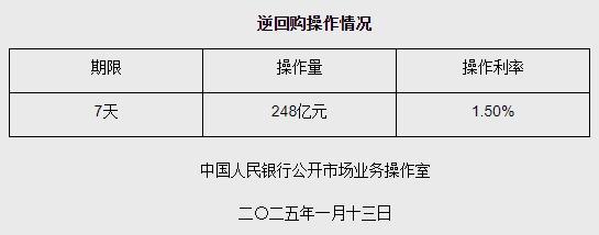 中新网1月13日电 据央行网站消息,为保持银行体系流动性充裕,2025年1月13日中国人民银行以固定利率、数量招标方式开展了248亿元逆回购操作。具体情况如下: