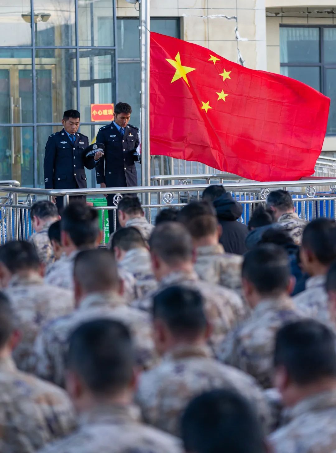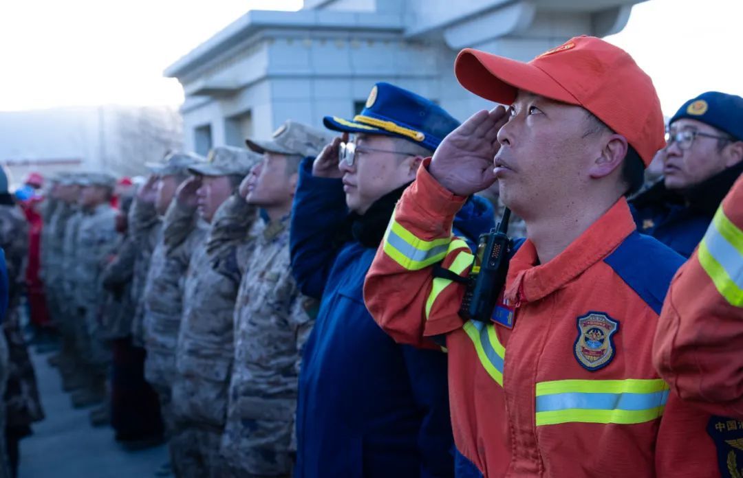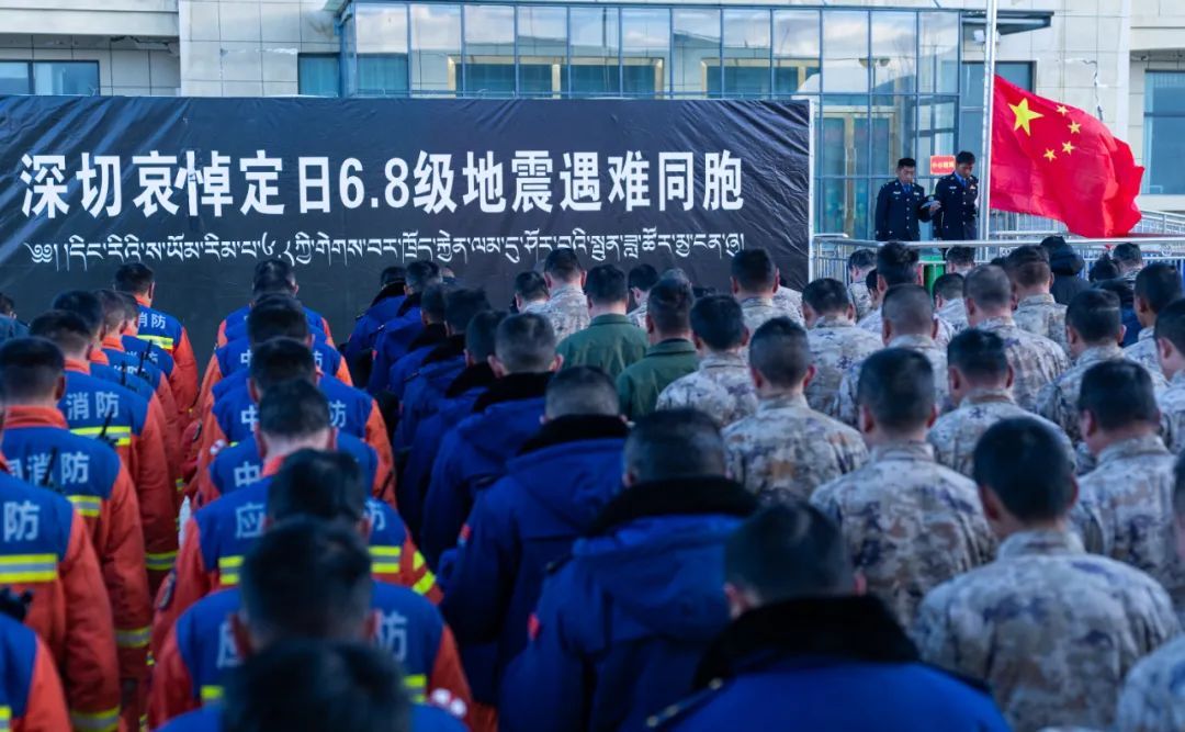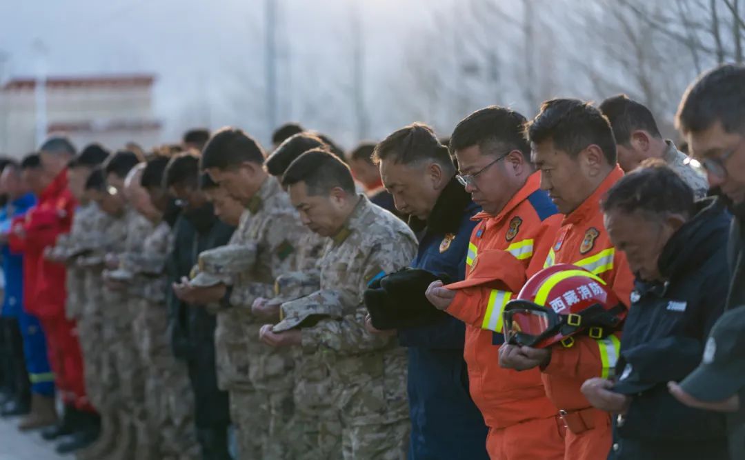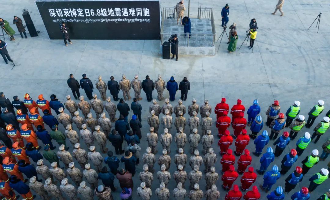 西藏定日6.8级地震遇难同胞悼念仪式13日上午9时30分在受灾最严重的长所乡举行。参与救援的解放军和武警官兵、消防救援人员、公安民警、医护人员、青年志愿者及有关企业员工、干部职工、震区群众代表数百人,脱帽肃立,向遇难同胞默哀3分钟。