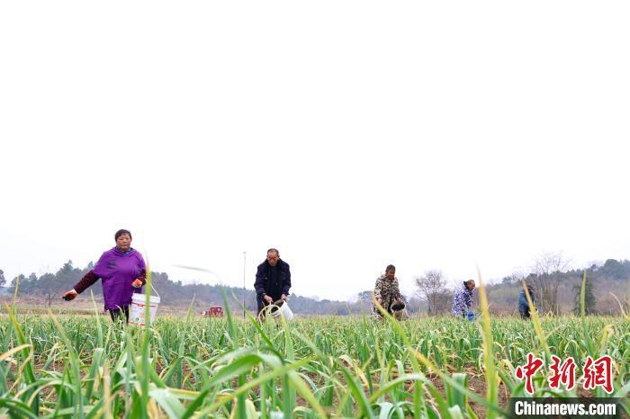 村民给大蒜施撒有机肥 。李想 摄