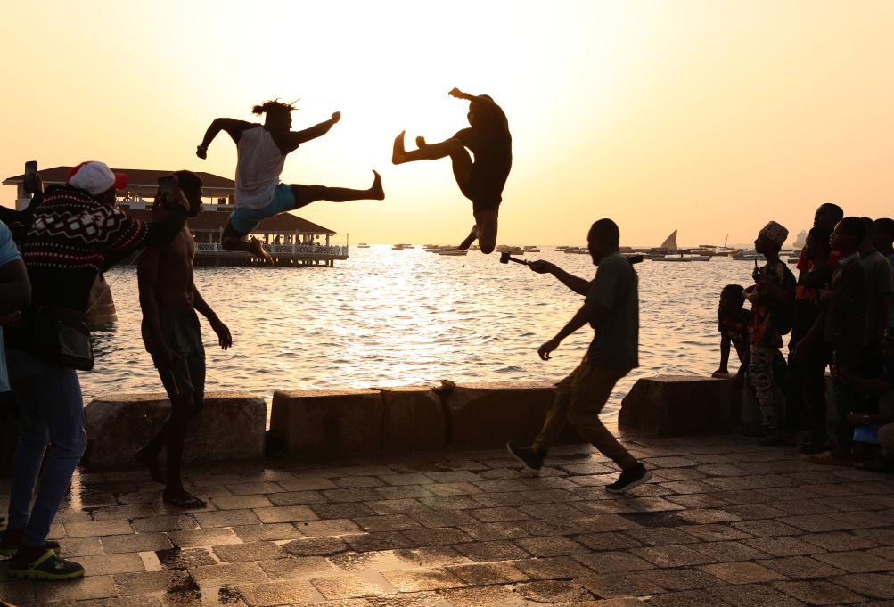 2023年2月21日,人们在坦桑尼亚桑给巴尔石头城的海边跳水。新华社记者董江辉摄
