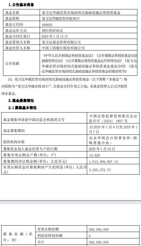 中国经济网北京1月14日讯 今日,易方达基金管理有限公司发布易方达华威农贸市场封闭式基础设施证券投资基金基金合同生效公告。