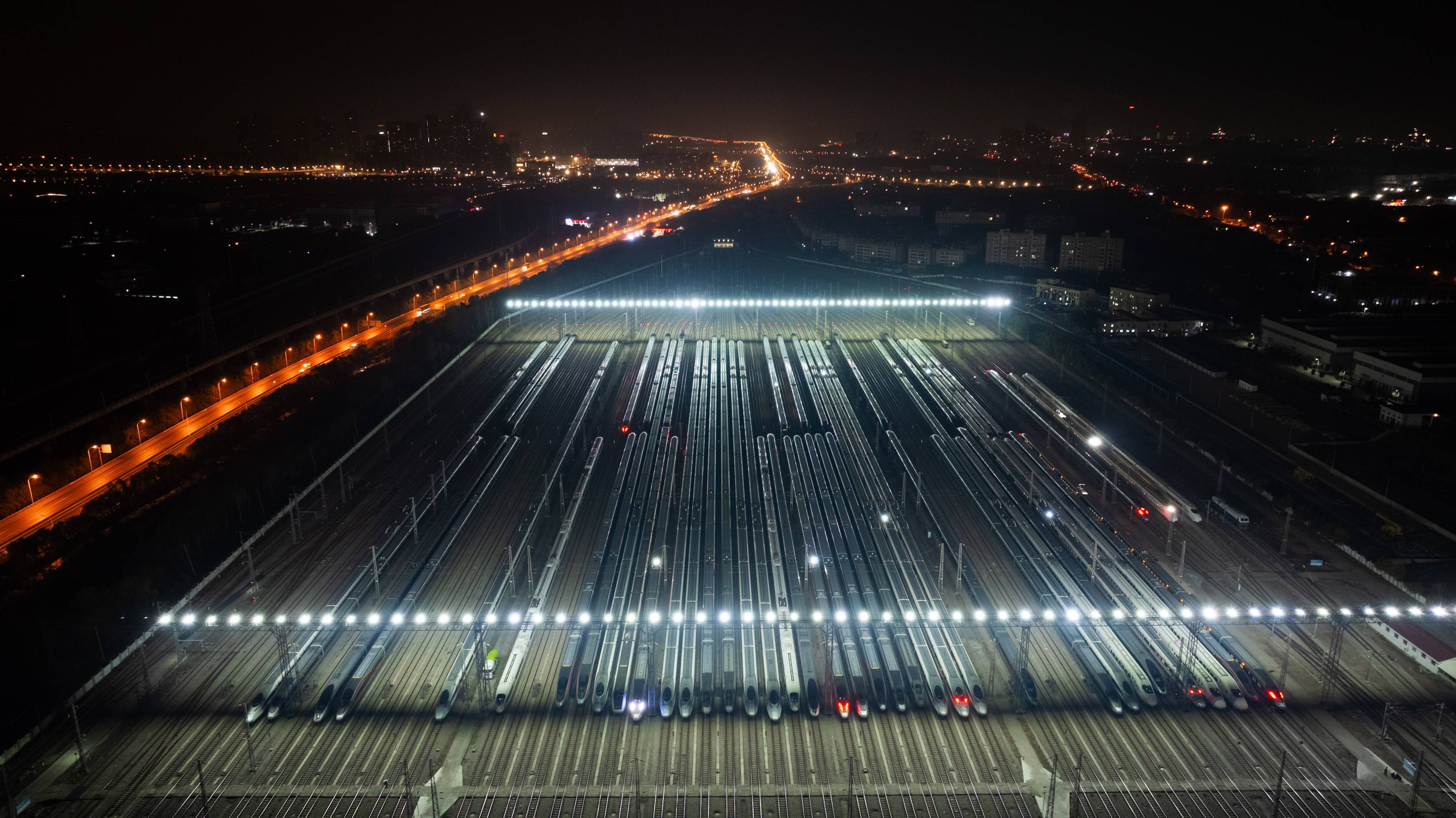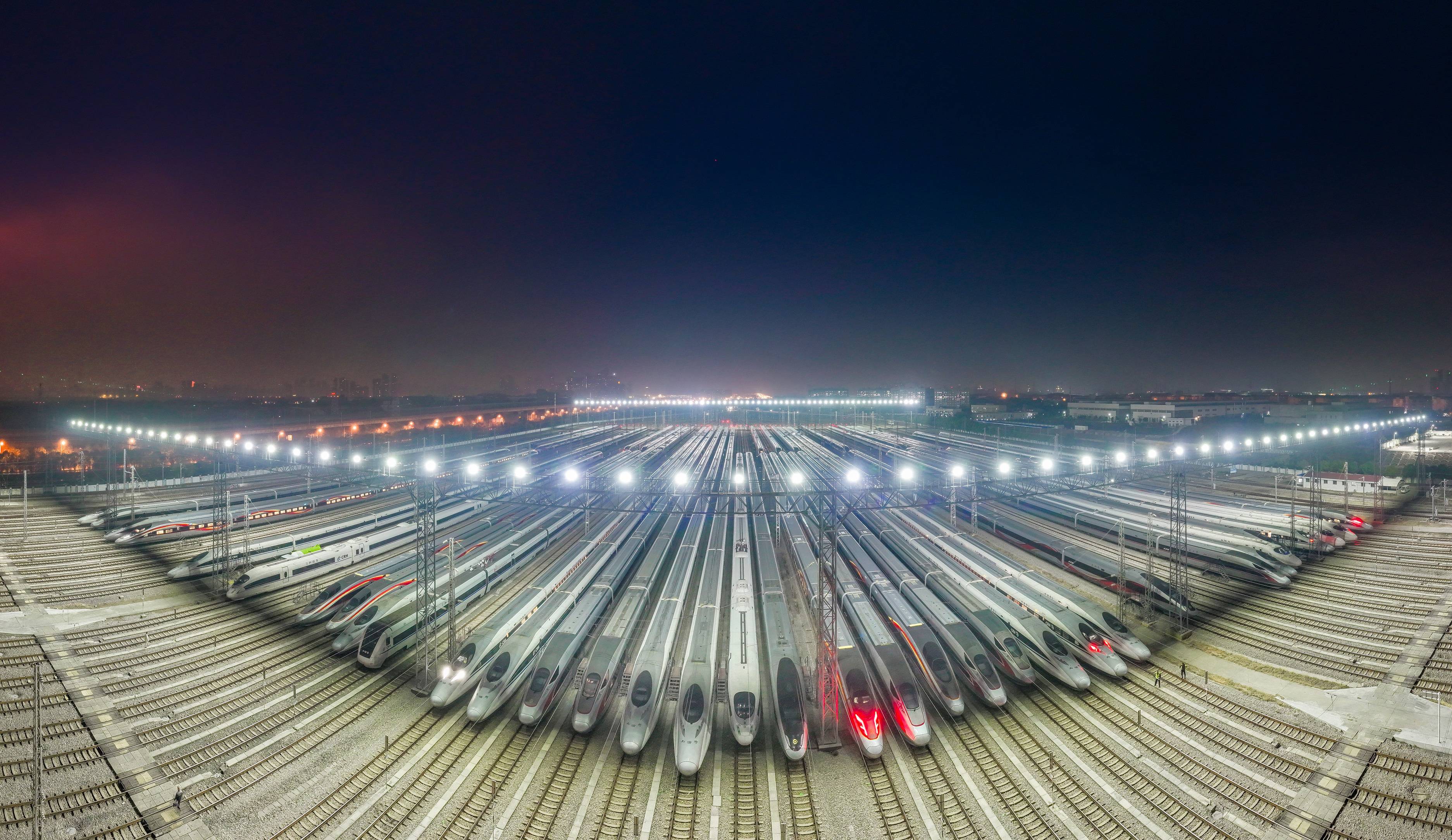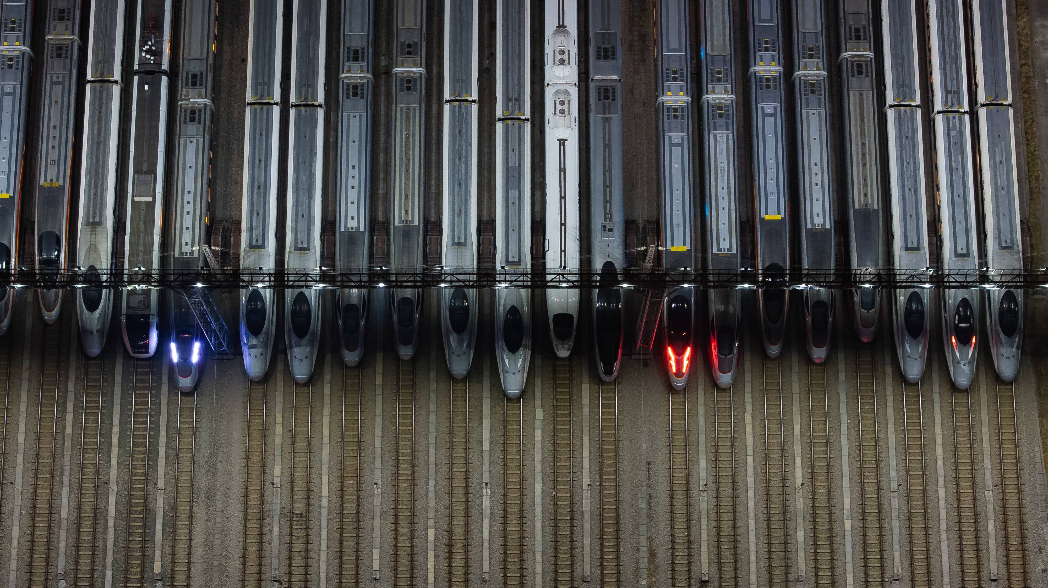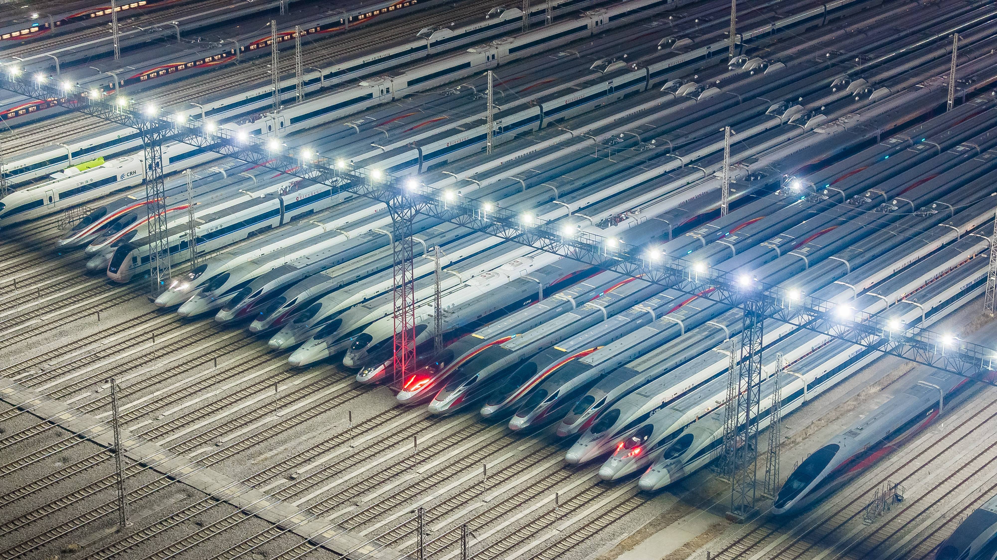 今日是2025年春运首日,近百组在武汉动车段经过检修、保温作业的动车组犹如“陆地舰队”,蓄势待发,迎接春运。(湖北日报全媒记者 柯皓 通讯员 单振标 杨彪 摄)