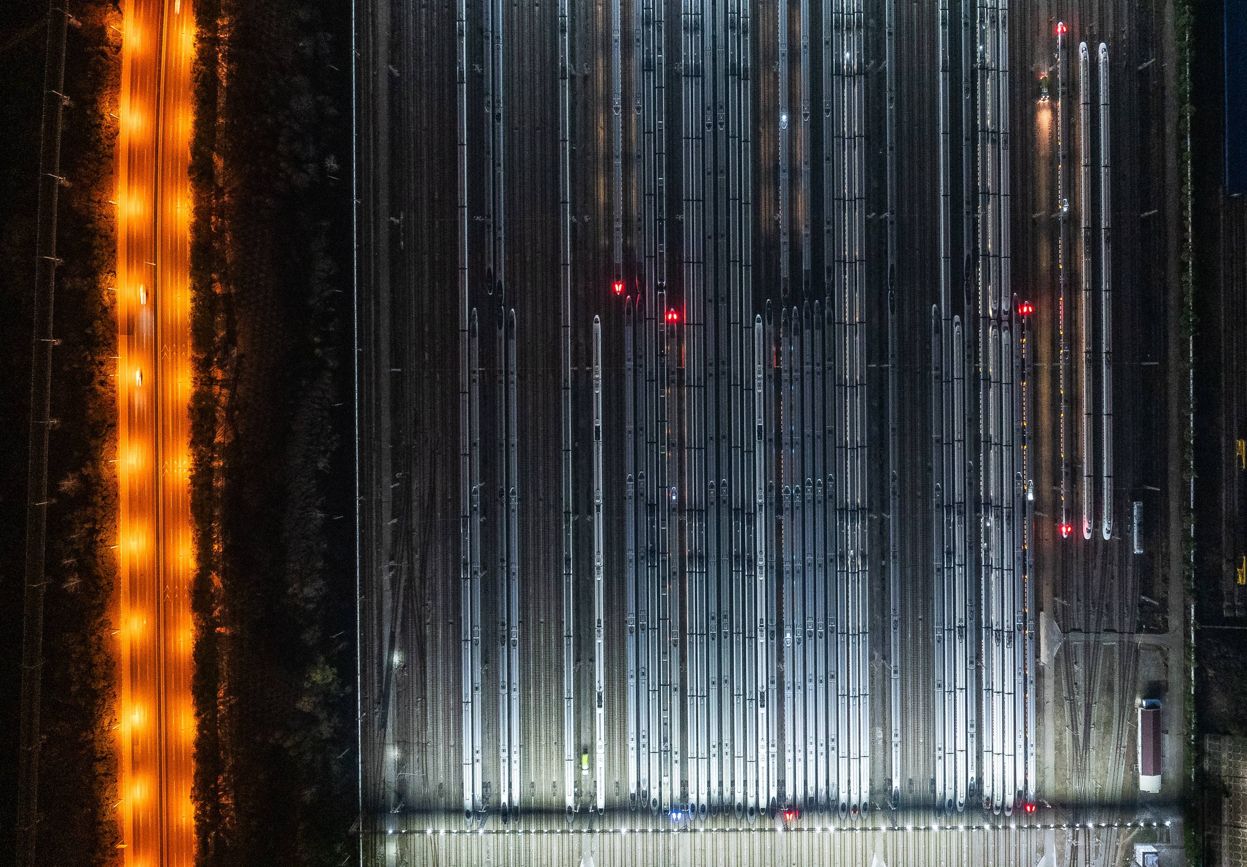 1月14日凌晨零时许,动车组列车停靠在武汉动车段的存车线上。