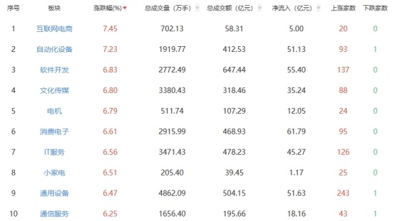 行业板块方面,互联网电商、自动化设备、软件开发等板块涨幅居前。