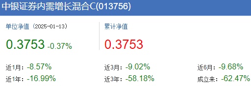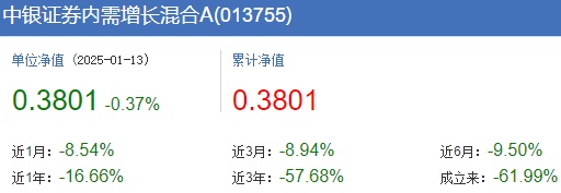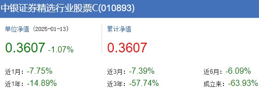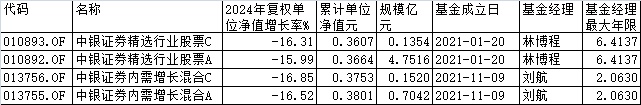 而巧合的是,两只基金不仅在去年跌幅相当,而且自成立至今都已经沦为“3毛基”。资料显示,中银证券精选行业股票成立于2021年1月20日,中银证券内需增长混合则成立于2021年11月9日。截至2025年1月13日收盘,两只基金A/C份额的收益率为-63.36%、-63.93%;-61.99%、-62.47%,单位净值为0.3664元、0.3607元;0.3801元、0.3753元。